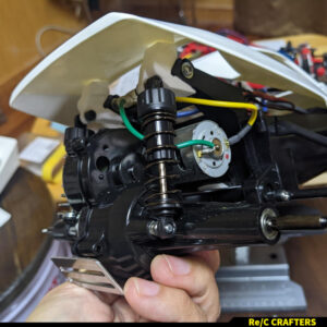 ギアボックス側のサス受けは既存のタッピングビスと適当なカラーで取付けることもできますが、できればギアボックスを一度分解して既存のビス穴をφ3mmのドリルで広げ、M3ビスとピロボールナットでピロボール化しておくとダンパーの取り外しがやりやすくなります。